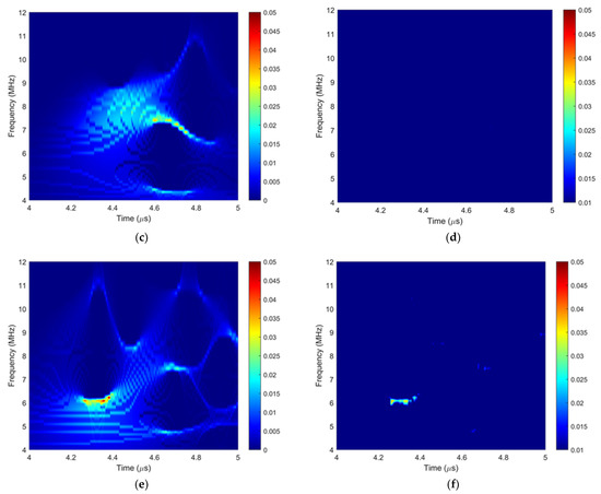 (a) Simulated time–frequency spectrum and (b) related difference in the transmitted signals between 10 elements in the intact composites, (c) simulated time–frequency spectrum, (d) related difference in the transmitted signals between 10 elements in the porous composites with a void with a 2 mm diameter and (e) simulated time–frequency spectrum and (f) related difference in the transmitted signals between 14 elements in the wavy composites.