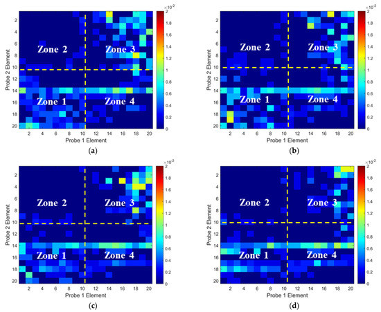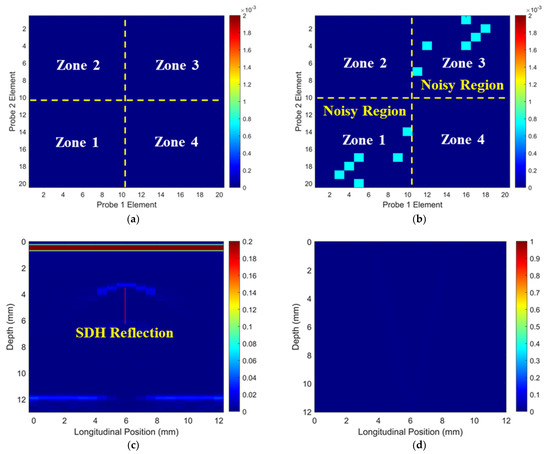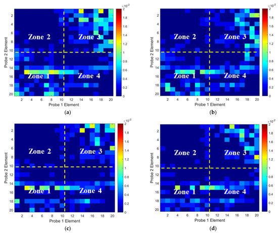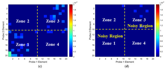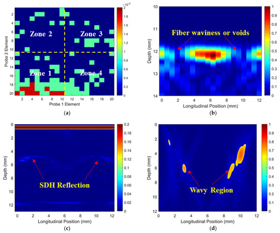 The simulated of the ultrasound propagating between different elements in the two probes within the non-wavy composites without and with a 2 mm-diameter void were calculated, and they are shown in Figure 5a and Figure 5b, respectively. Large voids induce slight ultrasound non-reciprocity when ultrasound propagates at large angles relative to the fibers, as shown in Zones 1 and 3 in Figure 5b. For ultrasound propagating within a 10-element range (i.e., Zones 2 and 4), no observable presents in either case. Ultrasonic B-scans constructed by reflected ultrasound energy and for the non-wavy composites with a 2 mm-diameter void are shown in Figure 5c,d. Two sets of FMC data acquired from 10 elements of the two probes (i.e., elements 1–11 and elements 10–20) were adopted to generate Figure 5d using the probability-based diagnostic algorithm (Equation (2)). The void (created by a 2 mm-diameter SDH) only generates clear indications in the traditional B-scan, as shown in Figure 5c.