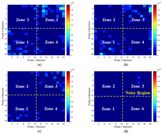 To validate the numerical predictions, the non-wavy composites without and with a 2 mm-diameter SDH were inspected experimentally. Firstly, the influence of excitation voltages on the ultrasound non-reciprocity was investigated. The experimental of ultrasound propagating within the non-wavy composites without and with a 2 mm-diameter void under different excitation voltages was calculated and is shown in Figure 6 and Figure 7, respectively. Under low-excitation voltages below 180 V, the measurable present in Zone 2 and 4 for both samples and the ultrasound non-reciprocity caused by the measurement system disappear when the voltages reach 200 V. This is because the signal-to-noise ratio of the transmitted ultrasound excited by low voltages is relatively low, which leads to calculation errors in the of the first-arrival wave. Therefore, the excitation voltage of 200 V is recommended to minimize the ultrasound non-reciprocity induced by the measurement system. Experimental ultrasonic B-scans constructed by reflected ultrasound energy and for the non-wavy composites with a 2 mm-diameter void are shown in Figure 8a,b. Experimental results shown in Figure 8 match well with the numerical predications shown in Figure 5. To sum up, by calculating in the time domain and optimizing the number of elements adopted for FMC data processing, large voids with a 2 mm diameter did not generate indications in the B-scans constructed by using the proposed probability-based diagnostic algorithm.