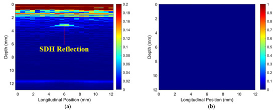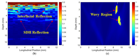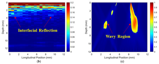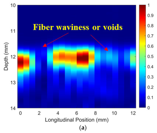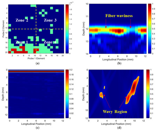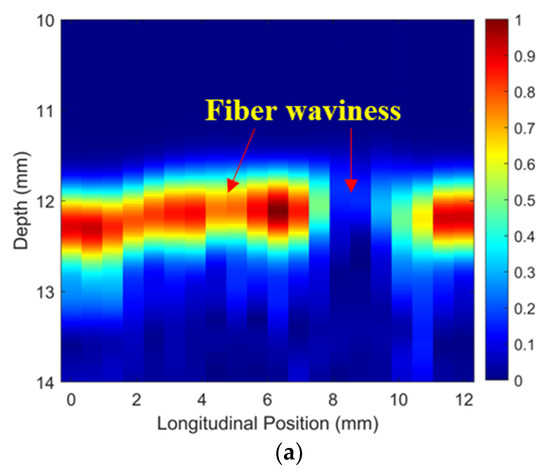 Simulated of ultrasound propagating in the wavy composites without voids were calculated and are shown in Figure 9a. Distinct from Figure 5a,b, a non-zero is present in both Zones 2 and 4, i.e., fiber waviness induces measurable ultrasound non-reciprocity. The ultrasound-transmitted energy between different elements of the two probes along the vertical direction is shown in Figure 9b. The energy loss caused by fiber waviness in two main regions is present (i.e., 2–4 mm and 8–10 mm in the longitudinal direction) due to the scattering and deflection of the ultrasound after passing through the wavy region. Ultrasonic B-scans constructed by reflected ultrasound energy and are displayed in Figure 9c and Figure 9d, respectively. Fiber waviness does not produce clear indications in the traditional B-scan image in Figure 9c, while the proposed probability-based diagnostic algorithm successfully images the wavy region. The position and intensity of the energy loss of the transmitted signals in Figure 9b match well with those of the wavy region in Figure 9d. In addition, the detected wavy region in Figure 9d (depth range: 4–6 mm and longitudinal position: 8–10 mm) agrees with the transition zone of the fiber angles in Figure 1d. Therefore, the proposed method is sensitive to the transition region of fiber waviness, where there is a drastic change in fiber angle from positive to negative values.