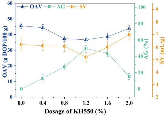 The CaCO3 particles were first modified by the ultrasound-assisted (12 min) KH550 treatment. The OAV, AG, and SV values of the CaCO3 were used to evaluate the modification performance. Smaller OAV and higher AG indicate better CaCO3 nanoparticle processability and surface hydrophobicity [28,29]. The SV can also reflect the dispersion potential of particles in the liquid phase. As shown in Figure 1, the OAV, SV, and AG of unmodified CaCO3 were found to be 45.56 g DOP/100 g, 6.2 mL/g, and 0%, respectively. With increased KH550 dosage, OAV and SV decreased first and then increased, whereas AG exhibited an opposite trend.