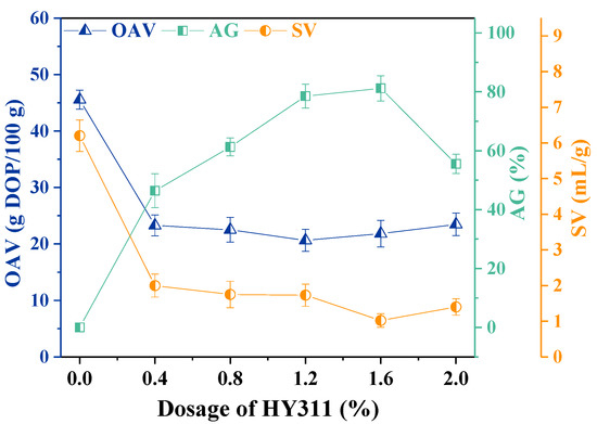 The OAV, AG, and SV of CaCO3 modified by HY311 combined with ultrasonic treatment of 12 min are shown in Figure 3. With the increasing amount of HY311, the changes in OAV, AG, and SV showed similar trends compared to Figure 2. When the addition of HY311 was increased to 1.2%, OAV decreased from 45.56 g DOP/100 g to a minimum of 19.13 g DOP/100 g, AG increased from 0 to a maximum of 92.98%, and SV decreased from 6.2 mL/g to a minimum of 0.9 mL/g. The AG and SV indicated enhanced modification performance with ultrasonic treatment.