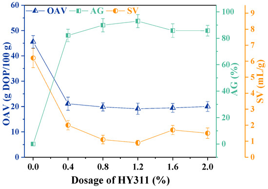 When the HY311 dosage increased from 0.4% to 1.2%, the number of CaCO3 particles coated with HY311 gradually increased. This led to a slight decrease in OAV, which was consistent with the findings of Hu et al. [26]. Then, with further increase in the amount of HY311, the surface coating of CaCO3 particles reached its saturation, and thus, there was not much change in OAV.