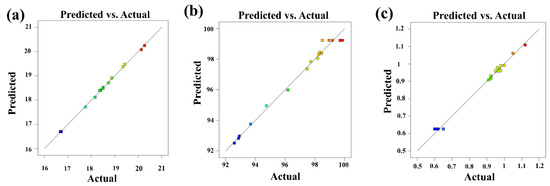 According to Figure 4a–c, the correlation coefficients (R2) between the predicted value and the real values of OAV, AG, and SV of modified CaCO3 were 0.9989, 0.9866, and 0.9926, respectively. The small differences between the predicted values and the real values indicated the good fit of the models. Taking the OAV, AG, and SV as the response values, the quadratic multinomial regression equations obtained by RSM tests are shown in the Supplementary Material as Equations (S1)–(S3). The analysis of variance of regression model equations are shown in Tables S1–S3. The p values of the models were all less than 0.001 (significant), indicating the high reliability of the models.