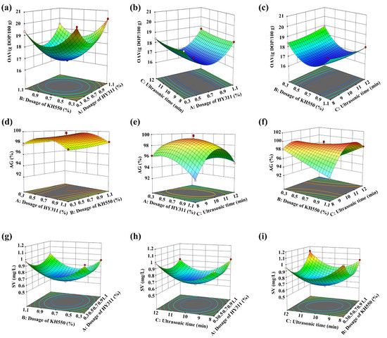 As shown in Figure 5, the 3D-response surface clearly showed the changes in OAV, AG, and SV after the modification of CaCO3. In Figure 5a–c, the OAV of modified CaCO3 changed with the addition of HY311 and KH550 and the different UST. When the dosages of HY311 and KH550 were 0.7% with a UST of 10 min, the OAV of modified CaCO3 was minimum, and the effect of CaCO3 modification was the best. The order in which the three factors influenced the response value OAV was: HY311 > KH550 > UST. This was consistent with the results of single-factor tests, in which HY311 had the best modification effect on CaCO3 when ultrasonicated for 12 min.