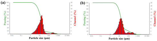 Particle size distribution of unmodified CaCO3 (a) and modified CaCO3 under the optimum modification conditions (b).
