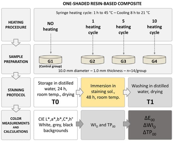 The color measurements were performed before (T0) and after (T1) the staining procedure for each heating group (Figure 1). A dental spectrophotometer (SpectroShade Micro, MHT, Niederhasli, Switzerland) was used for recording the CIE L*, a*, b*, C*, h° color coordinates of the samples over white (L* = 91.83; a* = −1.89; b* = 0.16), grey (L* = 46.53; a* = −1.55; b* = −1.28), and black backgrounds (L* = 1.60; a* = 2.09; b* = −2.90). A trained operator performed three consecutive measurements for all samples, and the instrument was calibrated before each measurement.
