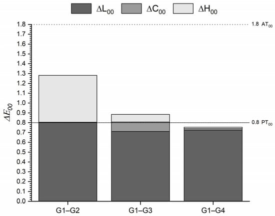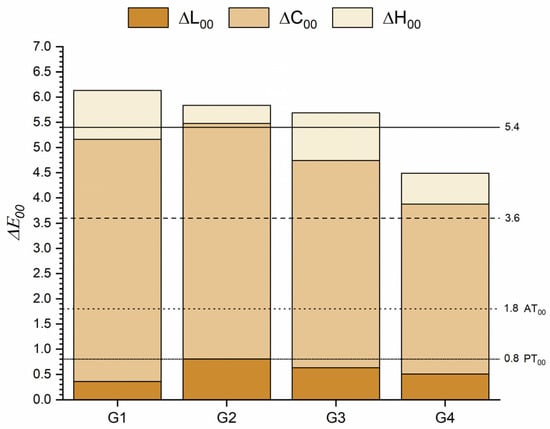 All values of the color differences were clinically interpreted by comparison with their respective 50:50% visual thresholds for perceptibility (PT00) and acceptability (AT00), determined in the literature [50,51] and recommended by the Technical Report ISO/TR 28642:2016 [52]: PT00 = 0.8 and AT00 = 1.8 units. Moreover, the ΔE00 units analyzed were divided into the three components: lightness (ΔL00), chroma (ΔC00), and hue (ΔH00), defined as follows [53]:
