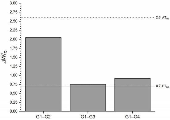 ΔWID after staining of the one-shaded resin-based composite for each group of heating cycles. (ΔWID between T0 and T1). Abbreviations: G1—Group 1; G2—Group 2; G3—Group 3; G4—Group 4; T0—Before staining procedure; T1—After staining procedure.