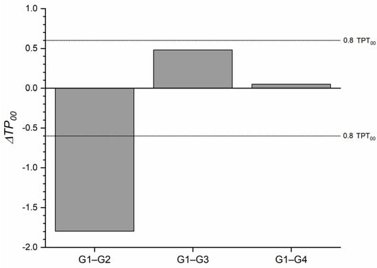 The ΔTP00 between all tested groups and the control groups for T0 is shown in Figure 4, where only at 1 heating cycle the ΔTP00 value exceeded the TPT00. However, after 5 heating cycles, the ΔTP00 increased without becoming perceptible.