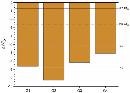 ΔWID of the one-shaded resin-based composite (G1) after 1 (G2), 5 (G3) and 10 (G4) heating cycles. Abbreviations: G1—Group 1; G2—Group 2; G3—Group 3; G4—Group 4.