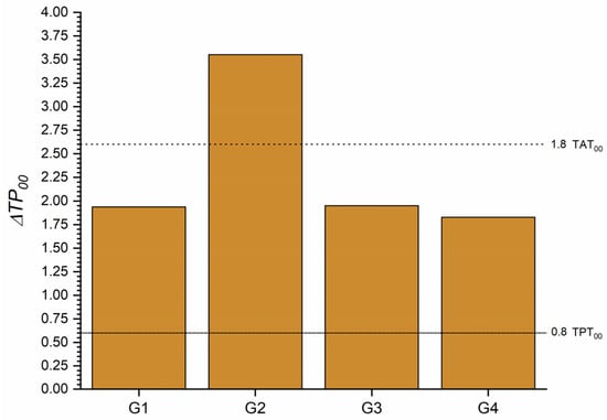 The ΔTP00 values obtained after the staining procedure are shown in Figure 7 and exceeded the TPT00 in all situations with similar values, except for group 2, which was higher than the TAT00.