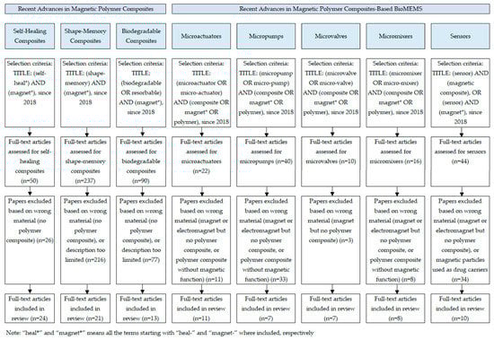 The subtopics discussed in this article are (1) “self-healing”, “shape-memory”, and “biodegradable composites” for the topic “recent advances in magnetic polymer composites”, and (2) “microactuators”, “micropumps”, “microvalves”, “micromixers”, and “sensors” for the topic “recent advances in magnetic polymer composites-based biomedical MEMS”. The relevant subtopics were determined based on older review articles covering magnetic polymer composites and electromagnetic MEMS and on the authors’ knowledge in the field. The number of full-text articles included in the review for each subtopic, after application of the abovementioned exclusion criteria, is shown in Figure 1. In addition, when deemed necessary by the authors, several publications were added to provide a better overview of the topic in addition to the articles selected using the terms and selection criteria in Figure 1.