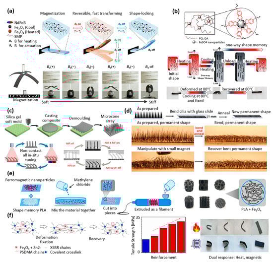 Shape-memory magnetic polymer composites. (a) Magnetic shape-memory composite with Fe3O4 and NdFeB magnetic particles embedded in an amorphous acrylate-based polymer matrix (reproduced with permission from Advanced Materials, Wiley) [40]. (b) Metallo-supramolecular poly(ε-caprolactone) (PCL)-based network using catechol chemistry, with thermal/magnetic/light-responsive two-way shape-memory effects. Illustration of the thermal-based shape-memory behavior of the composite (reproduced with permission from Macromolecules, ACS) [41]. (c) Shape-memory composites made of epoxy mixed with 5 μm iron particles, reversibly tuned between the tilted and upright state under near-infrared (NIR) irradiation and magnetic field (MF) actuation (reproduced with permission from Advanced Functional Materials, Wiley) [42]. (d) Photothermally reconfigurable magnetic cilia made of iron particles with thermoplastic polyurethane. The array of cilia was sheared between two glass slides to create the bending deformation, followed by clamping the array of bent cilia between the slides and annealing at high temperature (80 °C or 180 °C depending on the polymers used as matrix). After cooling and removing the mechanical constraints, the new permanent shape was set and persists after manipulating the cilia with a magnet (shown in the Figure). The same effect was also observed when combining a magnet with illumination to set a temporary shape of cilia and then illuminating without the magnet to recover the permanent shape (not shown in the Figure). (reproduced with permission from Advanced Materials Technologies, Wiley) [43]. (e) Bone tissue scaffolds made of magnetic shape-memory polymer composites, processed by 3D printing technology (reproduced with permission from Composites Science and Technology, ScienceDirect) [44]. (f) Shape-memory polymers based on carboxylic styrene butadiene rubber (XSBR)/ferriferrous oxide (Fe3O4)/zinc dimethacrylate (ZDMA) (reproduced with permission from Ind. Eng. Chem. Res., ACS) [45].