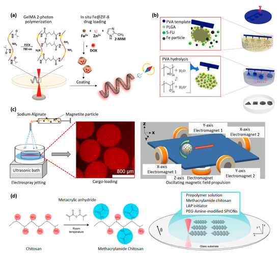 Biodegradable magnetic polymer composites. (a) Biodegradable helical microrobot, made of gelatin methacryloyl and fabricated by two-photon polymerization (reproduced with permission from Advanced Healthcare Materials, Wiley) [57]. (b) Biodegradable PLGA/Fe/5-FU microrobots, fabrication process (reproduced with permission from Sensors and Actuators B: Chemical, ScienceDirect) [59]. (c) Biodegradable capsules for drug delivery made of alginate hydrogel, loaded with Fe3O4 particles (reproduced with permission from Journal of Colloid and Interface Science, Elsevier) [60]. (d) Biodegradable microswimmers for drug delivery based on chitosan loaded with iron oxide (magnetite) particles (reproduced with permission from ACS Nano) [61].
