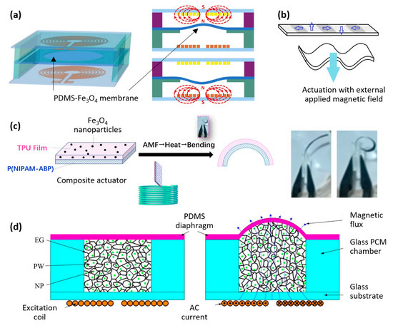 Magnetic polymer composite-based microactuators (2/3). (a) Bi-directional electromagnetic microactuator based on PDMS-Fe3O4 nanocomposite magnetic membrane (reproduced with permission from Microelectronic Engineering, Elsevier) [71]. (b) A new technique for microstructuring gel-based magnetic composites for microactuators, which relies on using a laser to soften certain areas of the composite and exposing them to magnetic fields in different directions [72]. (c) Alternative magnetic field-induced thermo-responsive composite actuator. AMF: Alternative magnetic field. (Reproduced with permission from Nanomaterials, MDPI) [73]. (d) Working principle of the phase change material-composite-based microactuator with induction heating. EG, PW, and NP stand for expanded graphite, paraffin wax, and nickel particle, respectively (reproduced with permission from Sensors and Actuators A, Elsevier) [74].