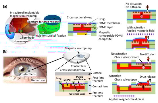- Wang, C.; Park, J. Magnetic micropump embedded in contact lens for on-demand drug delivery. Micro Nano Syst. Lett. 2020, 8, 1–6. [Google Scholar] [CrossRef]