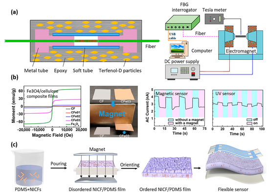 - Yang, W.; Tian, H.; Liao, J.; Wang, Y.; Liu, L.; Zhang, L.; Lu, A. Flexible and strong Fe3O4/cellulose composite film as magnetic and UV sensor. Appl. Surf. Sci. 2020, 507, 145092. [Google Scholar] [CrossRef]
