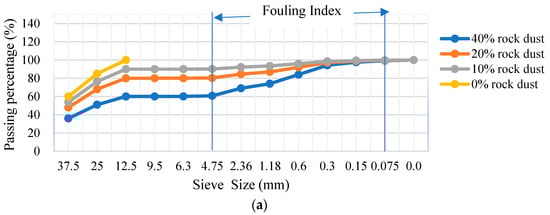 The level of fouling was determined based on the fouling index (F1), whereby values lower than 1 indicate clean ballast, 1–10 reasonably clean, 10–20 moderately clean, 20–40 fouled ballast, and greater than 40 highly fouled, considering the large mesh sieves, as shown in Equation (2).