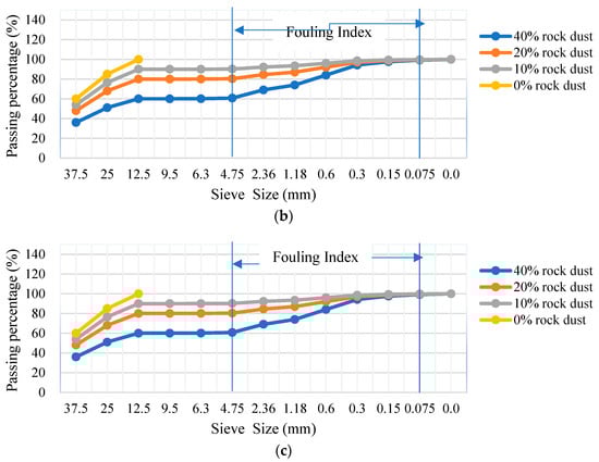 Figure 2a–c show the particle size distribution of the metagranites (Mg1 and Mg3) and gneiss with different fouling rates (0%, 10%, 20%, and 40%).