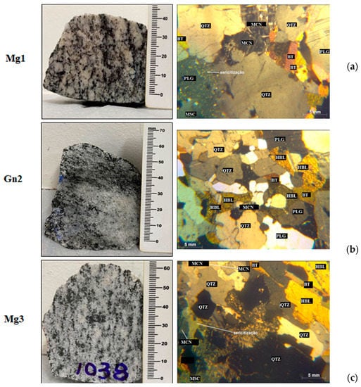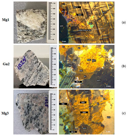 LEFT: Macroscopic view and RIGHT: Microscopic features of the: (a) meta granites Mg1; (b) gneiss Gn2; (c) meta granites Mg3. Crossed Nicols. LEGEND: Qtz—quartz, Plg—plagioclase, Bt—biotite, HBL—hornblende, Mq—mirmequite, Msc—muscovite, Mcn—microcline.