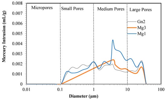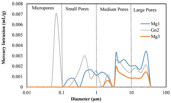 The different pore sizes of the samples are shown in Figure 3. Gn2 shows greater mercury intrusion into its micropores and varying pore sizes (small, medium, and large), while Mg1 and Mg3 contain no micropores.