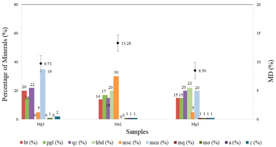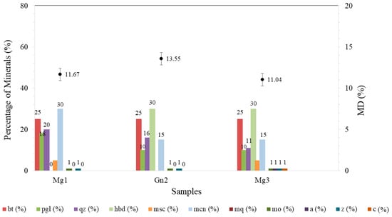 All the samples exhibited a variation in weight loss after the test. Mg1 showed a variation of approximately 1.94% (9.73–11.67%; Figure 8) and Gn2 around 0.27% (13.28–13.55%; Figure 8). The lower mass loss in the latter rock may be due to its mineralogical composition (Table 3), whereby the percentage of hard minerals present led to less surface polishing in the particles. Mg3 displayed the greatest variation among the samples, with 2.54% (8.50–11.04%; Figure 8).