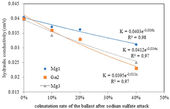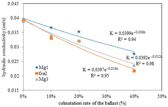 Hydraulic conductivity values for ballast with 0 (≈4.0 × 10−2 cm/s) to 20% fouling were lower than those recorded at 40% fouling. The highest values were observed for Mg1 due to the presence of protruding diagonal cracks in the microcline (Figure 3). The results shown in Figure 9 indicate that hydraulic conductivity varied from fouling onset.