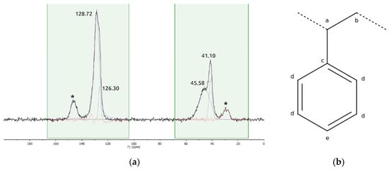 The signals at 41.1 ppm and 45.6 ppm in the spectrum of the gel-type parent resin (Figure 1a) can be assigned to the backbone carbon atoms (a, b; Figure 1b). The signal at 146.3 ppm is due to the aromatic carbon atoms directly bound to the polymer chains (c; Figure 1b), and the signals at 128.7 and 126.3 ppm can be attributed to the non-functionalised aromatic carbon atoms (d, e; Figure 1b) [].
