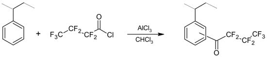 The procedure for the acylation of styrenic resins with hydroacyl chlorides in CS2 [] proved ineffective because perfluorobutyryl chloride is insoluble in this solvent. The complete dissolution of the required amount of perfluorobutyryl chloride was achieved in chloroform, and a material hereafter referred to as Gel_C4F7O was prepared (Scheme 1).