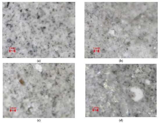 Images of the surface of concrete samples: (a) without calcium stearate; (b) the concentration of the hydrophobic additive is 0.8%; (c) the concentration of the hydrophobic additive is 1.1%; (d) the concentration of the hydrophobic additive is 1.3%.