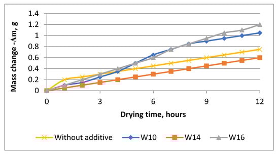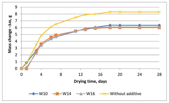 Figure 3 shows that the change in the mass of cement stone samples with additives in the amount of 1.1% and 1.3% reaches constant values within 13–14 days; the samples showed the smallest change in mass during air hardening. In samples with a concentration of 0.8% calcium stearate additive, mass transfer processes slow down after 15 days of testing. Drying of the sample without additives takes place on the 18th day of exposure to air while achieving the maximum change in mass for the studied objects.
