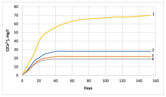 Determination of the kinetics of dissolution and leaching of calcium ions from cement stone by an aggressive chloride-containing medium was carried out when samples were immersed in a 2% MgCl2 solution. The content of calcium cations in the liquid medium was determined by the method described in Section 2.6. During the tests, it was found that the state close to the equilibrium concentration of calcium cations in the solution is reached after 14 days of stay of hydrophobized cement stone samples in a corrosive environment (curves 2, 3, and 4 in Figure 4) [58,77], whereas, for samples without a hydrophobizing additive, the equilibrium state occurs after 150 days of testing (curve 1 on Figure 4).