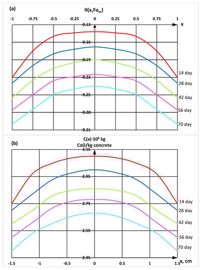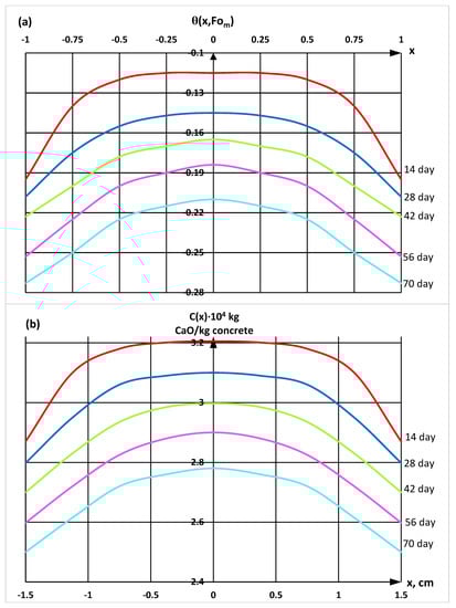 The initial condition (Equation (18)) shows that at the time taken as the starting point, the concentration of the transferred component («free calcium hydroxide») has a distribution over the thickness of the concrete structure.
