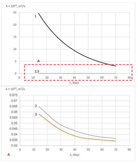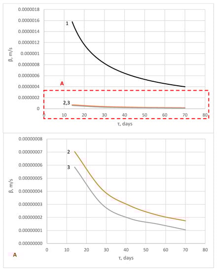 Figure 8 shows that the mass conductivity coefficient of hydrophobized cement stone samples under corrosion in a 2% MgCl2 solution varies exponentially. The curves have a flatter appearance compared to the curve of a non-hydrophobized sample, which indicates a significantly lower rate of corrosion processes in this case. The mass transfer coefficients behave in a similar way (Figure 8).