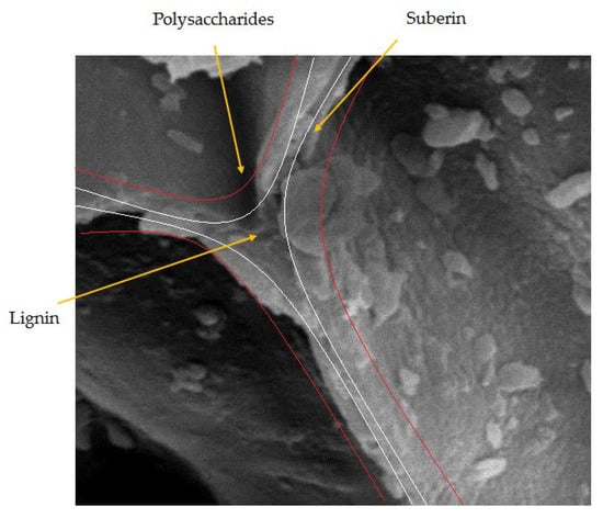 The macroscopic cellular structure of cork presents an alveolar structure similar to a honeycomb with close cellular structure and thin-walled cells. The cells are rectangular prisms, packed base-to-base in columns parallel to the radial direction of the tree. The walls of cork cells are made of a thin, lignin-rich middle lamella (internal primary wall), a thick secondary wall of suberin and wax lamella and an outer tertiary wall of polysaccharides such as cellulose and hemicellulose (Figure 1) [13,14].