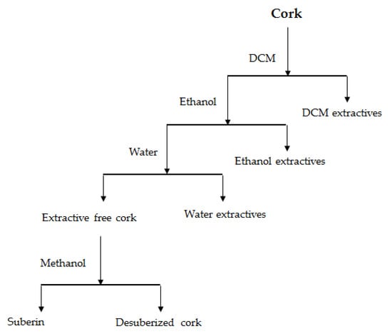 In order to determine cork composition, chemical analyses that included the determination of ash, extractives, suberin, lignin and cellulose were carried out. All experiments were performed in duplicate. The ash content was determined by incinerating 2 g of cork at 500 °C over 12 h, following TAPPI standard T 15 os-58. Successive Soxhlet extractions (Figure 2) were performed using 3 g of samples to separate extractives with dichloromethane (DCM) for 6 h, ethanol for 8 h and water for 20 h, following TAPPI standards (T204 om-88 and T207 om-93) [38,39]. After each extraction step, the solution was evaporated, and the solid residue weighed. The suberin content of the cork was determined using an extractive-free material by methanolysis for de-polymerization [40]. A total of 1.5 g of extractive-free cork was refluxed with 250 mL of 3% NaOCH3 in CH3OH over 3 h, filtered and then refluxed with CH3OH for 15 min. After filtration, the residue was acidified with 2 M H2SO4 to pH 6 and evaporated in a rotating evaporator. The residue was suspended in 100 mL of water and extracted with 100 mL CHC13 three times; then the combined extracts were dried over Na2SO4 salt, filtered, evaporated and weighted as suberin. Lignin was determined after acid hydrolysis with 72% H2SO4 at 30 °C for 2 h and boiling for 4 h after dilution with water to 4% H2SO4, following TAPPI T-222 standard. The residue was washed with hot water, dried and determined as lignin [41,42].