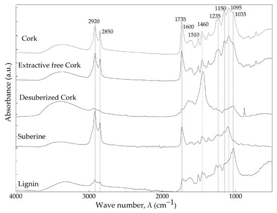 The spectrum of the extractive-free cork was identical to the one of the cork powder, which can be due to the relatively low amount of extractives in the cork (see Table 1).