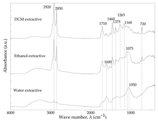 Spectrum of dichloromethane extractives (DCM) showed a broad absorbance band with low intensity between 3700 cm−1 and 3000 cm−1, which is characteristic of hydroxyl groups. This band has a significantly lower intensity than that of polar extractives. The strong peaks at 2920 cm−1 and 2850 cm−1 are characteristic of symmetric and asymmetric C–H vibrations present in the aliphatic structure of terpenes of the waxy material. At 1710 cm−1, characteristic peaks of carbonyl as carboxylic acid function group and at 1460 cm−1 characteristic of aromatic C–C vibration were presented [54,55,56]. In addition, the peak at 720 cm−1 was attributed to the C–H bond related to the vinyl group of terpenes [51].