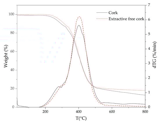 Thermogravimetric analyses were carried out in order to characterize the role of each component in thermal stability of cork powder. Comparative thermogravimetric curves (TG) of pyrolysis and the first derivative of TG curves (dTG) obtained for cork and extractive-free cork are presented in Figure 6. In addition, the temperature corresponding to the maximum mass loss rate (Tpeak), mass loss (ML) of each decomposition step and the amount of residue remained at 800 °C are shown in Table 2.