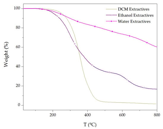 As it is possible to see in Figure 7, at 5% of mass loss, ethanol extractives showed a lower decomposition temperature compared to DCM and water extractives. Furthermore, above 350 °C, the polar extractives (ethanol and water extractives) showed a lower mass loss rate compared to the one observed for non-polar DCM extractives. In fact, the non-polar extractives only presented a 1.6% residue at 800 °C (see Table 2). Meanwhile, the amount of residue at 800 °C for water and ethanol extractives was 60.1% and 16.7%, respectively.
