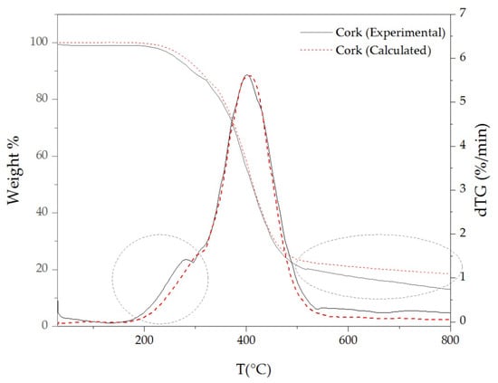 The calculated curves show, between 200 °C and 300 °C, a slightly higher thermal stability than those registered in the experimental curves of cork. Thus, when extractives are inherently present in the cork composition, they promote a slightly higher thermal decomposition than expected in that range of temperature. Moreover, between 500 °C and 800 °C, the calculated curve shows a higher weight percentage than that of the experimental curve. These facts reinforce the catalytic effect of extractives on the beginning and end of cork thermal decomposition.