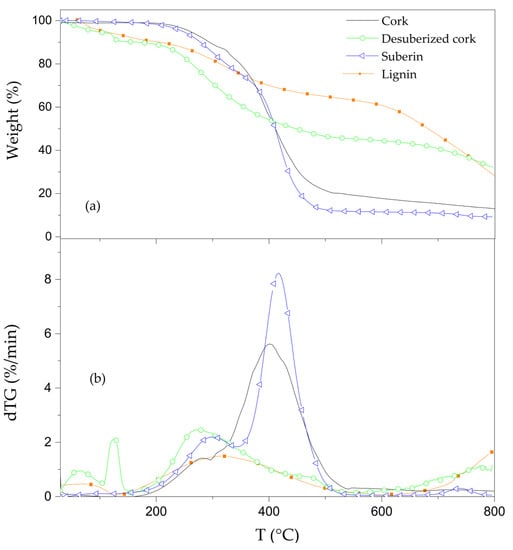 The comparative TG and dTG of cork, desuberized cork, suberin and lignin are shown in Figure 9. Desuberized cork (or suberin free cork) showed a lower thermal stability than cork below 400 °C. This might be due to a higher loss of free and bounded water also observed in the case of polysaccharides from different bio-materials [61,62,63]. Its major mass loss occurred at 270 °C, 130 °C lower than that of cork, confirming the thermal stability effect of suberin on cork thermal behavior. The higher residue observed in the desuberized cork samples could be due to the presence of sodium from the sodium methoxide, used for the extraction of suberin [7].