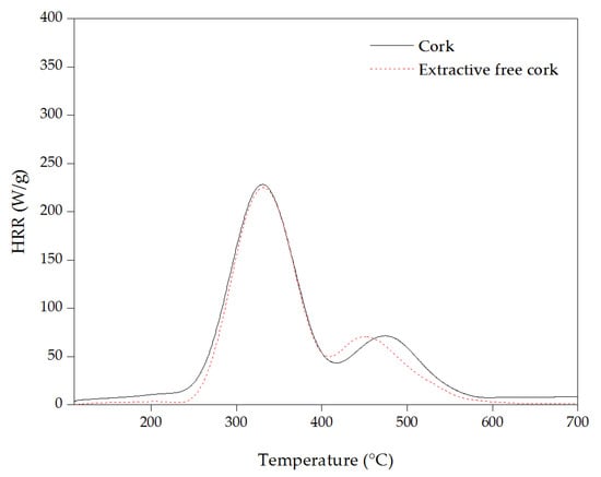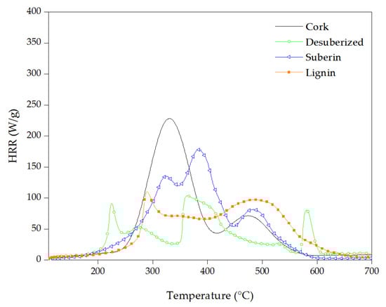 In order to assess the flammability properties of cork and its components, a micro-scale combustion calorimeter (MCC) was used. In general, the fire behavior of materials is characterized by the amount of released heat when the material is exposed to a fire. MCC allows to obtain the HRR of materials using a low amount of the sample [64]. As it was described in Section 2, the MCC analysis consists of first heating the sample under pyrolysis conditions in a nitrogen atmosphere; then the degradation gases are purged by an inert gas to the combustor, a chamber at 900 °C with a mixture of nitrogen (80%) and oxygen (20%), where these products are oxidized. The most representative flammability parameters, pHRR (peak heat release rate), TpHRR (temperature to pHRR) and THR (total heat released) are summarized in Table 3. TpHRR represents the maximal heat flow temperature, and THR is obtained by integration of MCC curves.