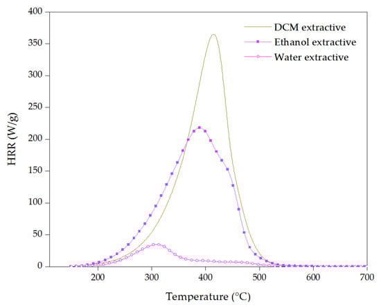 Heat release rate curves for cork extractives are presented in Figure 11. The highest value of pHRR, 365 W/g at 410 °C, was registered for dichloromethane extractive. This non-polar extractive started to decompose at 190 °C in one step with almost no residue remaining, showing its high flammability. Ethanol extractive started at 180 °C with a pHRR of 220 W/g at 385 °C, and then water extractive at about 200 °C with a pHRR of 35 W/g at 310 °C, which reached its pHRR at a lower temperature; however, its pHRR and THR were much lower compared to DCM and ethanol extractives. DCM extractives showed the highest TpHRR, and together with ethanol extractive, they can be considered the main combustible parts of extractives with the highest pHRR and THR, which can be due to the presence of highly combustible compounds such as waxes, fatty acids and triterpene [53,65].
