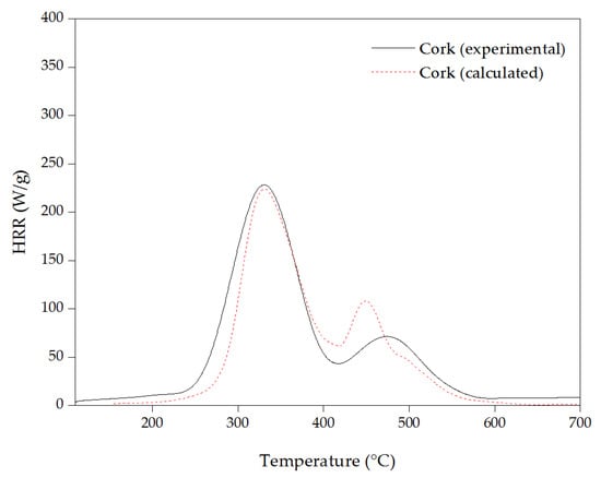 In Figure 12, experimental and calculated HRR curves of cork are compared. The calculation was obtained from the HRR contribution of the extractive-free cork and individual extractives, calculated cork = (86% × extractive-free cork + 7% × DCM extractives + 3% × ethanol extractives + 4% × water extractives).