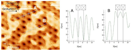 We measured the moiré periodicity across the area with intercalated and non-intercalated graphene (see Figure 3). The lines in the STM image and the corresponding line profiles marked as A and B were associated with non-intercalated and intercalated graphene, respectively. From profiles A and B, we can draw two conclusions: (i) the moiré periodicity of the Au intercalated graphene equals the periodicity of the non-intercalated graphene on Ir(111)—25 Å; and (ii) the corrugation of the intercalated graphene is substantially smaller (0.12 Å) than the corrugation of bare graphene (0.35 Å), suggesting a reduced interaction of the graphene with gold compared to iridium. At this point, it is interesting to compare these parameters for graphene on the Au(111) surface [5], where the moiré periodicity was found to be 17 Å. The corrugation of graphene on Au(111) was measured to be a tenth of the corrugation on Gr/Ir(111)—just 0.04 Å.