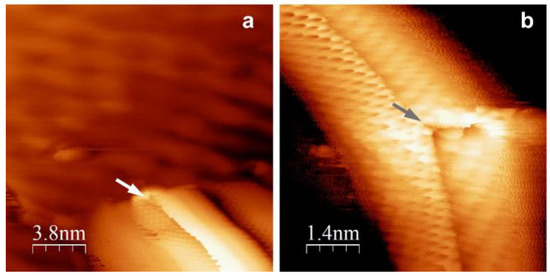 STM images of graphene wrinkles. Arrows are pointing to the defect sites. Scanning parameters: (a) 251 mV, 2.2 nA; (b) −320 mV, 2.6 nA.