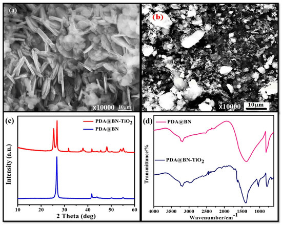 SEM images of (a) PDA@BN, (b) PDA@BN-TiO2, and (c) XRD patterns of PDA@BN, and PDA@BN-TiO2. (d) FT-IR spectra of PDA@BN and PDA@BN-TiO2.