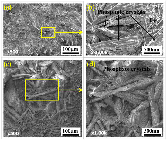 High-resolution SEM of phosphate coating in PBT-0 (a,b) and PBT-0.3 (c,d).